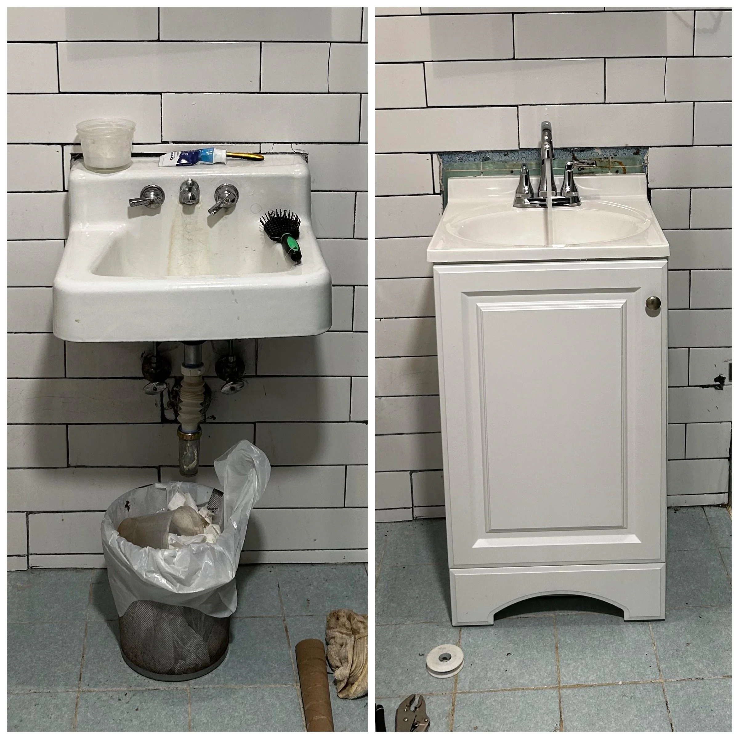 Toilets, faucets, sinks, pipes.
